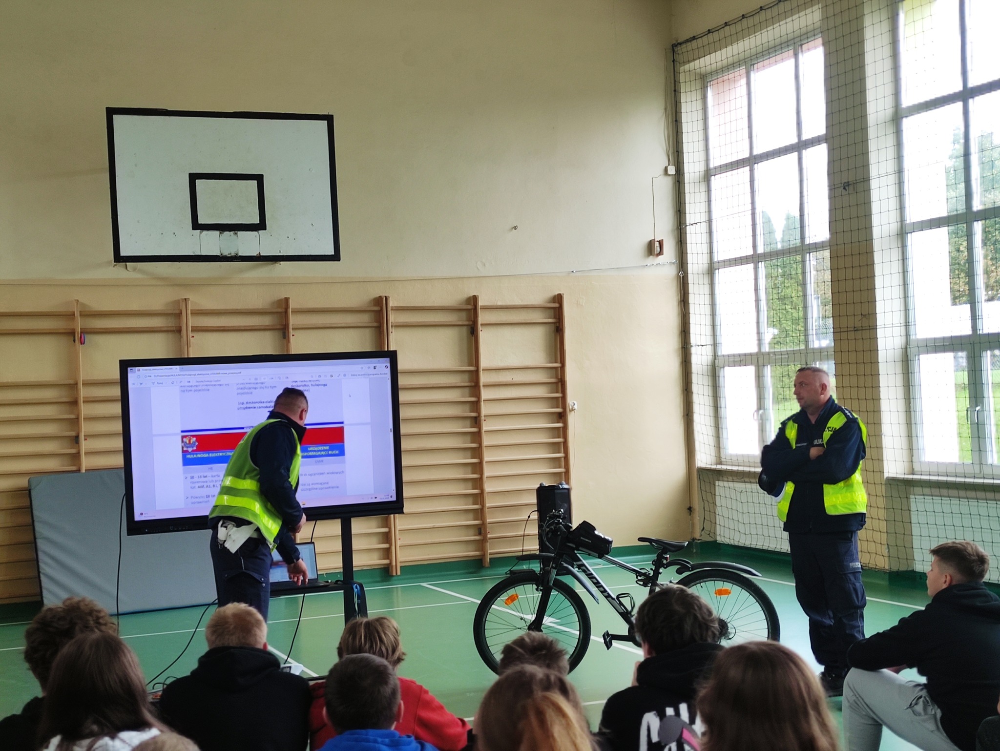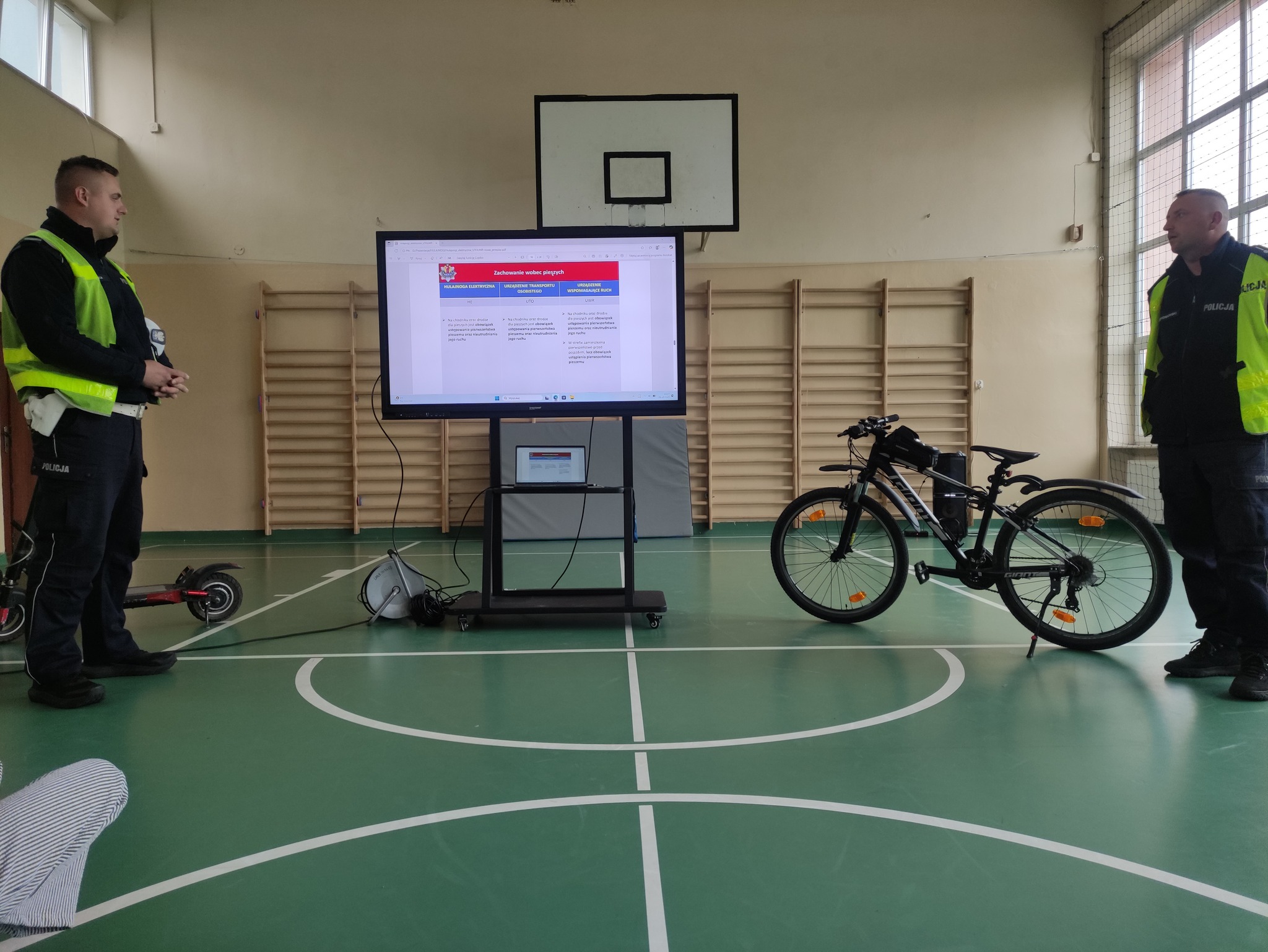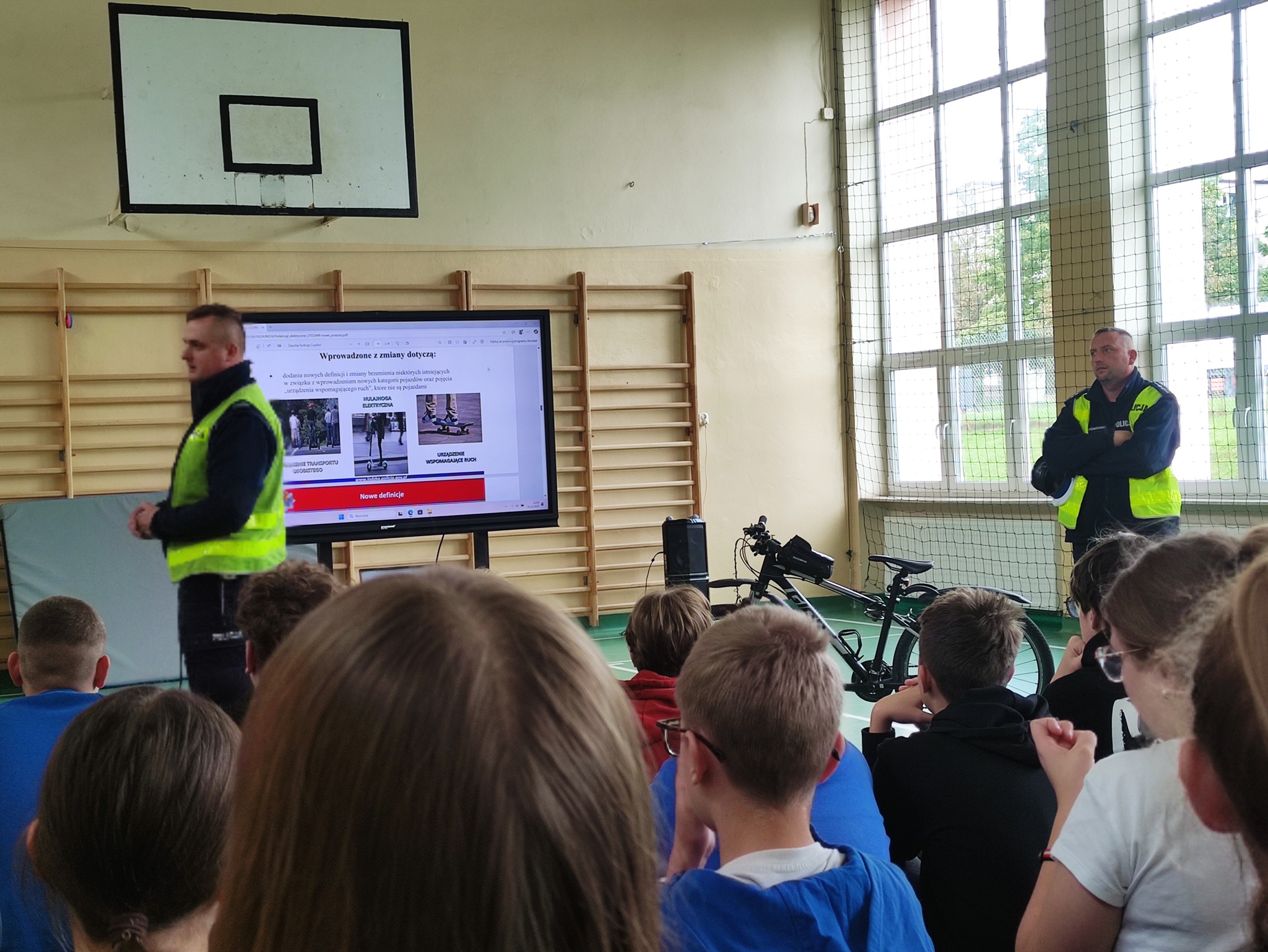 Podczas spotkania omówiono również najczęstsze błędy popełniane przez młodych użytkowników dróg oraz konsekwencje nieprzestrzegania przepisów. Uczniowie dowiedzieli się, gdzie można legalnie poruszać się hulajnogą elektryczną, jak prawidłowo korzystać ze ścieżek rowerowych i jakie zasady obowiązują na chodnikach oraz przejazdach dla rowerów.