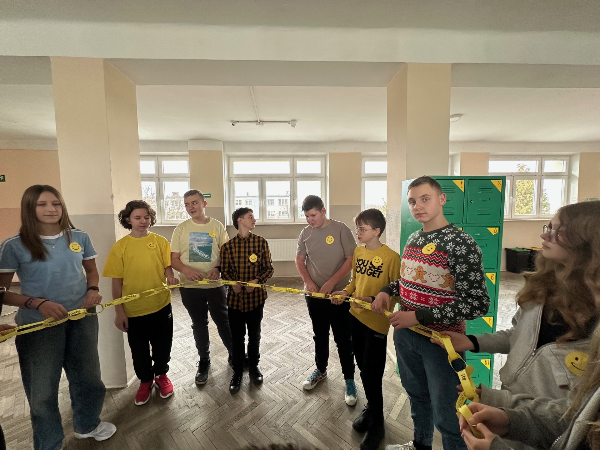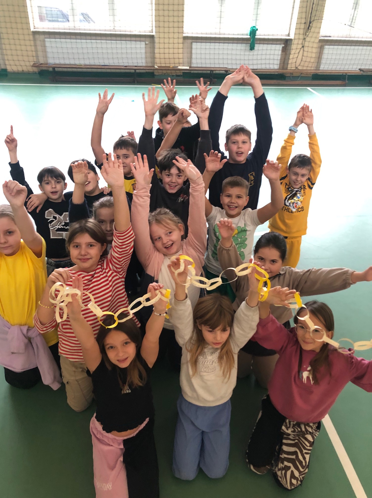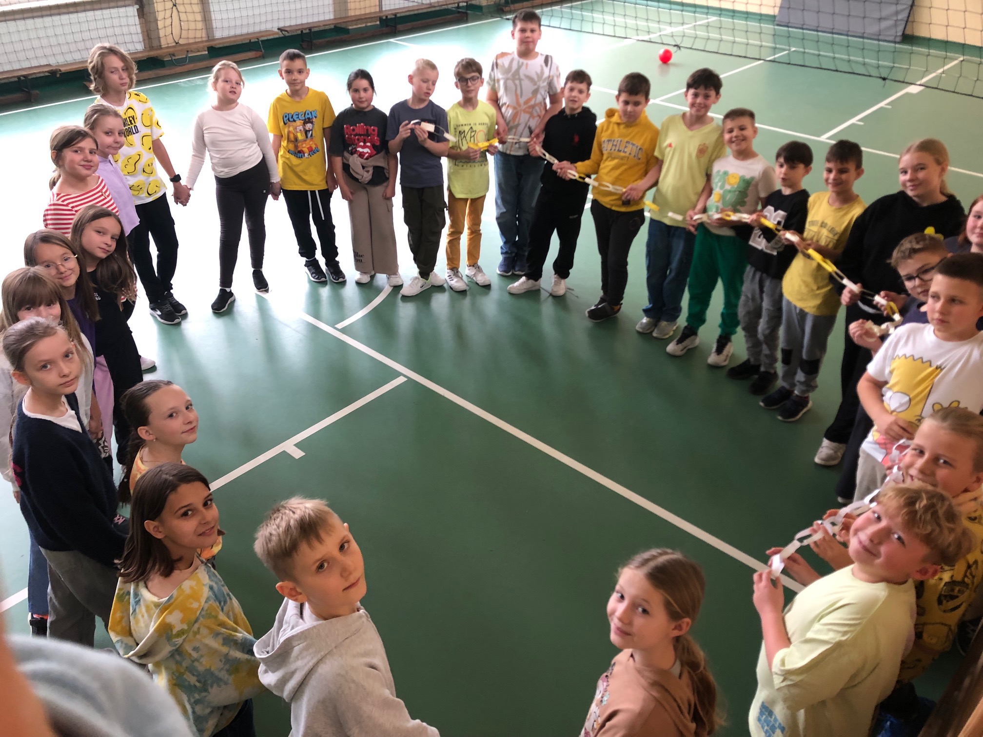 Z kolei klasy 4–8 wzięły udział w akcji „łańcuchów życzliwości”. Każdy uczeń dopisał swoje dobre słowo lub miły gest na kolorowych paskach, które po połączeniu stworzyły długi, symboliczny łańcuch dobrych uczynków.