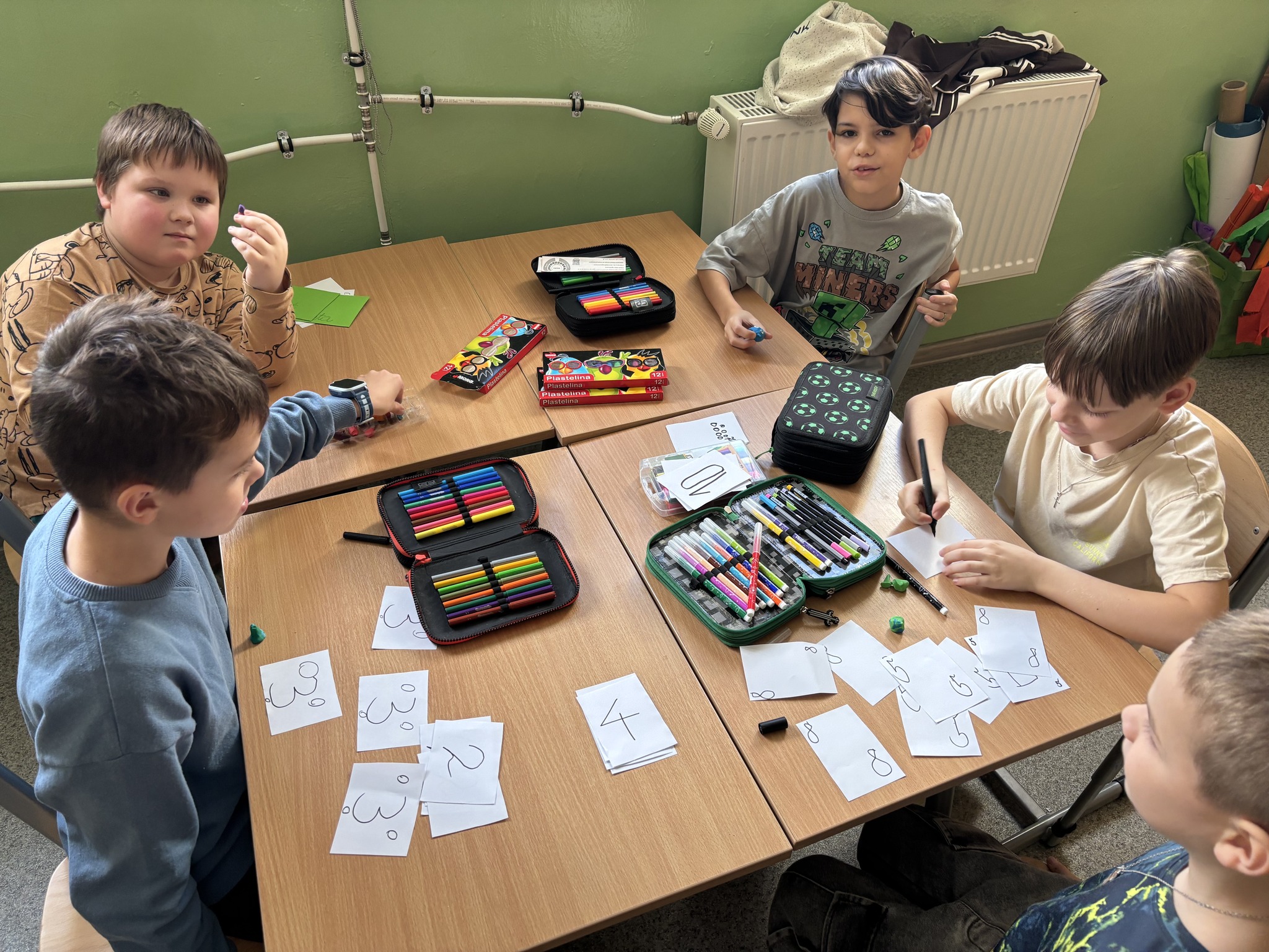 Podczas zajęć rozwijających uzdolnienia matematyczne nasi drugoklasiści wcielili się w prawdziwych projektantów gier! Pracując w grupach, stworzyli własną grę planszową „Matematycznego ślimaka”. Uczniowie samodzielnie wykonali planszę, ulepili z plasteliny pionki i – przy wsparciu nauczyciela – ustalili zasady gry.