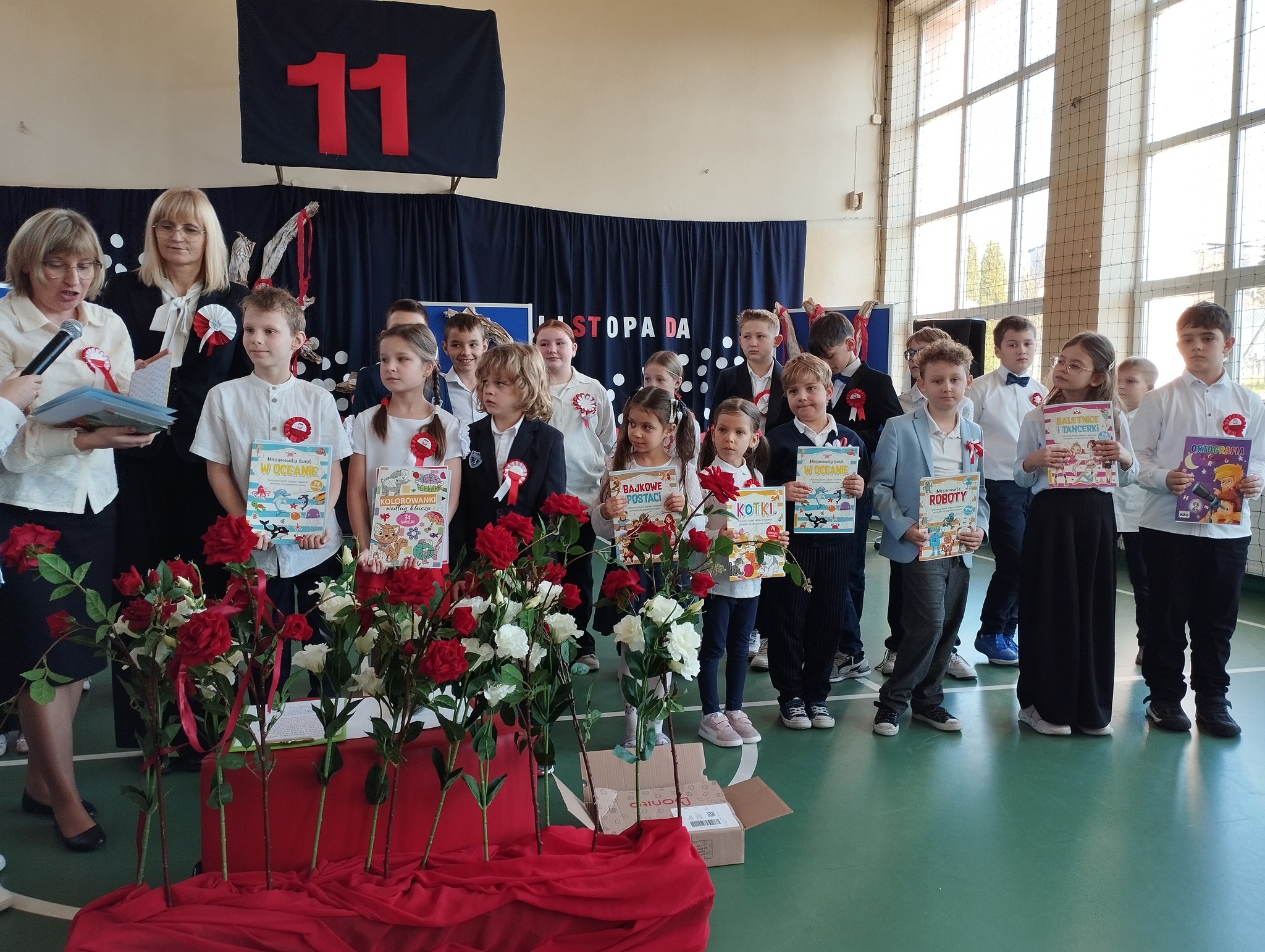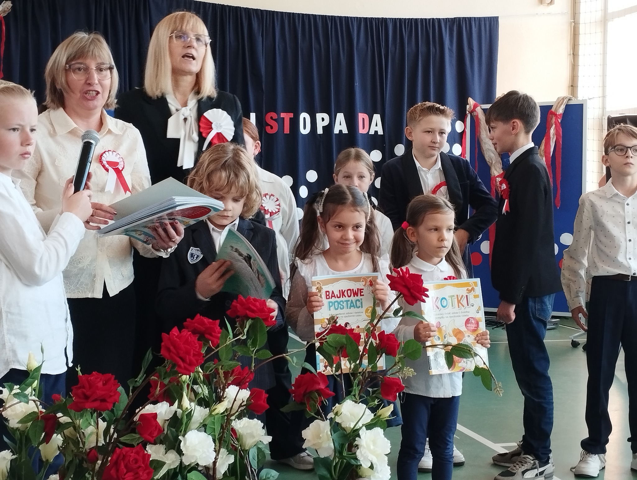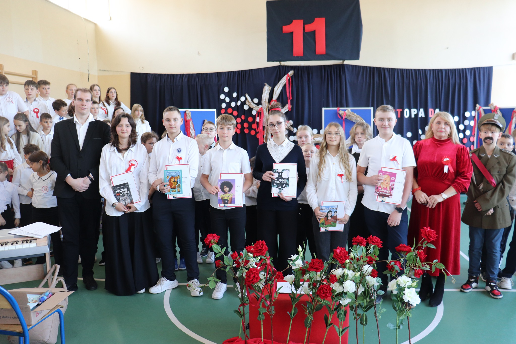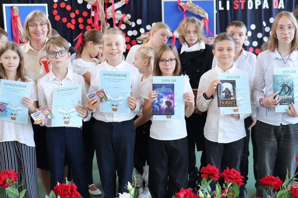 Uroczystości towarzyszyło wręczenie nagród za niedawno przeprowadzone szkolne konkursy: konkurs recytatorski poezji patriotycznej i biblioteczny konkurs plastyczny "Mały Molik".