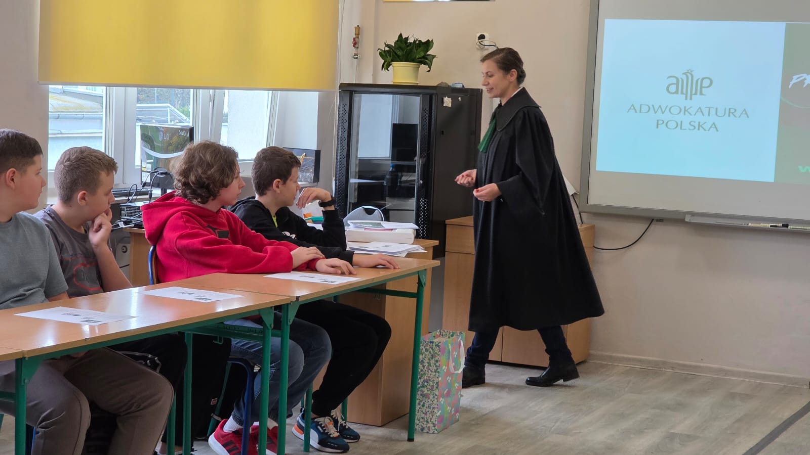 Pani mecenas opowiedziała również o ścieżkach kariery po ukończeniu studiów prawniczych. Uczniowie dowiedzieli się, że absolwenci prawa mogą pracować nie tylko jako adwokaci czy sędziowie, ale także m.in. jako prokuratorzy, notariusze, radcy prawni, mediatorzy, a nawet specjaliści w firmach zajmujących się ochroną danych czy bezpieczeństwem cyfrowym.