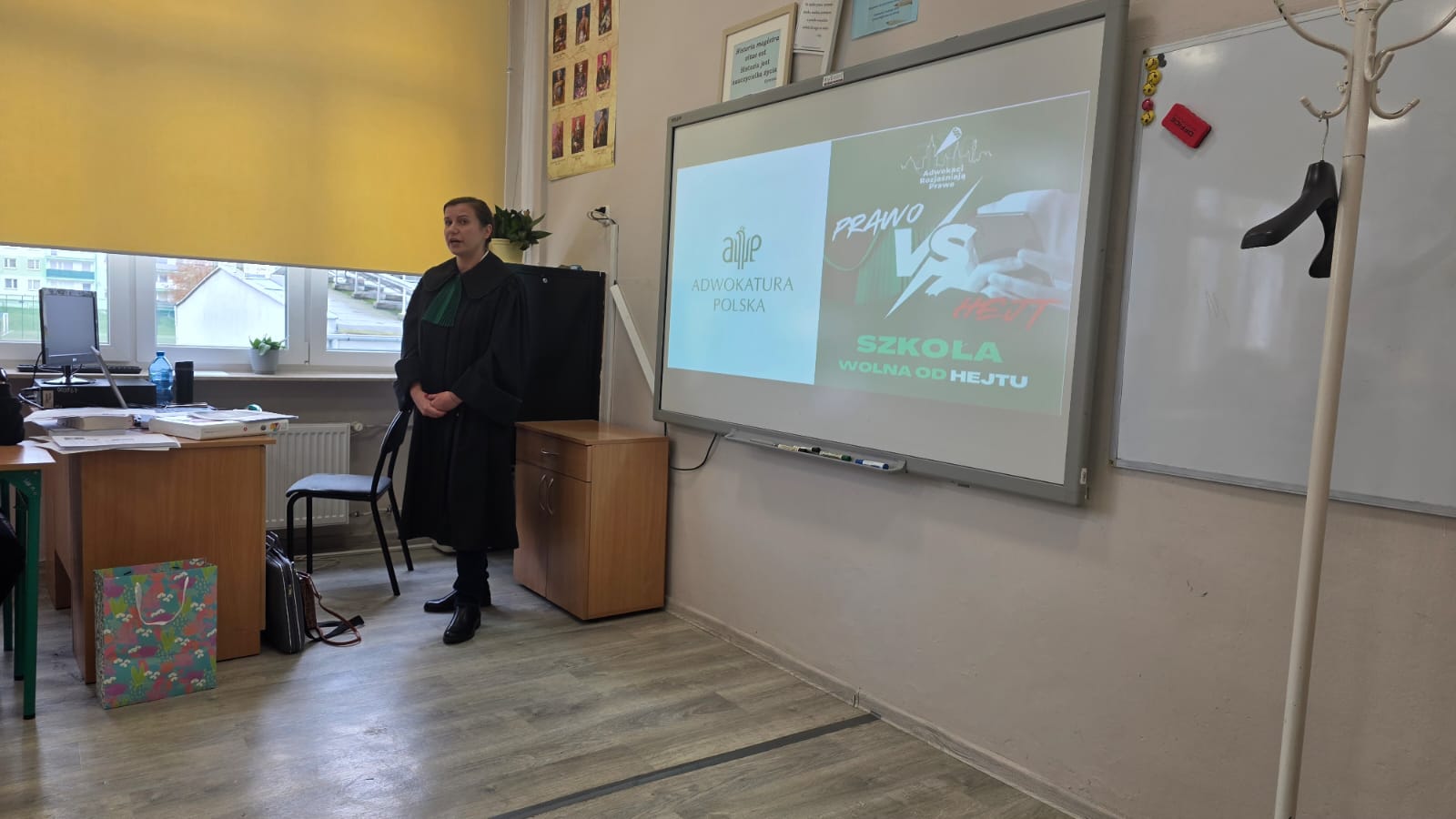 Zajęcia miały charakter warsztatowy, dzięki czemu uczniowie mogli aktywnie uczestniczyć w rozmowie, analizować przykłady sytuacji z życia codziennego oraz wspólnie zastanawiać się nad tym, jak reagować na przemoc w internecie. Pani mecenas w przystępny sposób wyjaśniła, czym jest cyberprzemoc, jakie ma formy i jakie konsekwencje prawne mogą ponosić sprawcy takich działań.