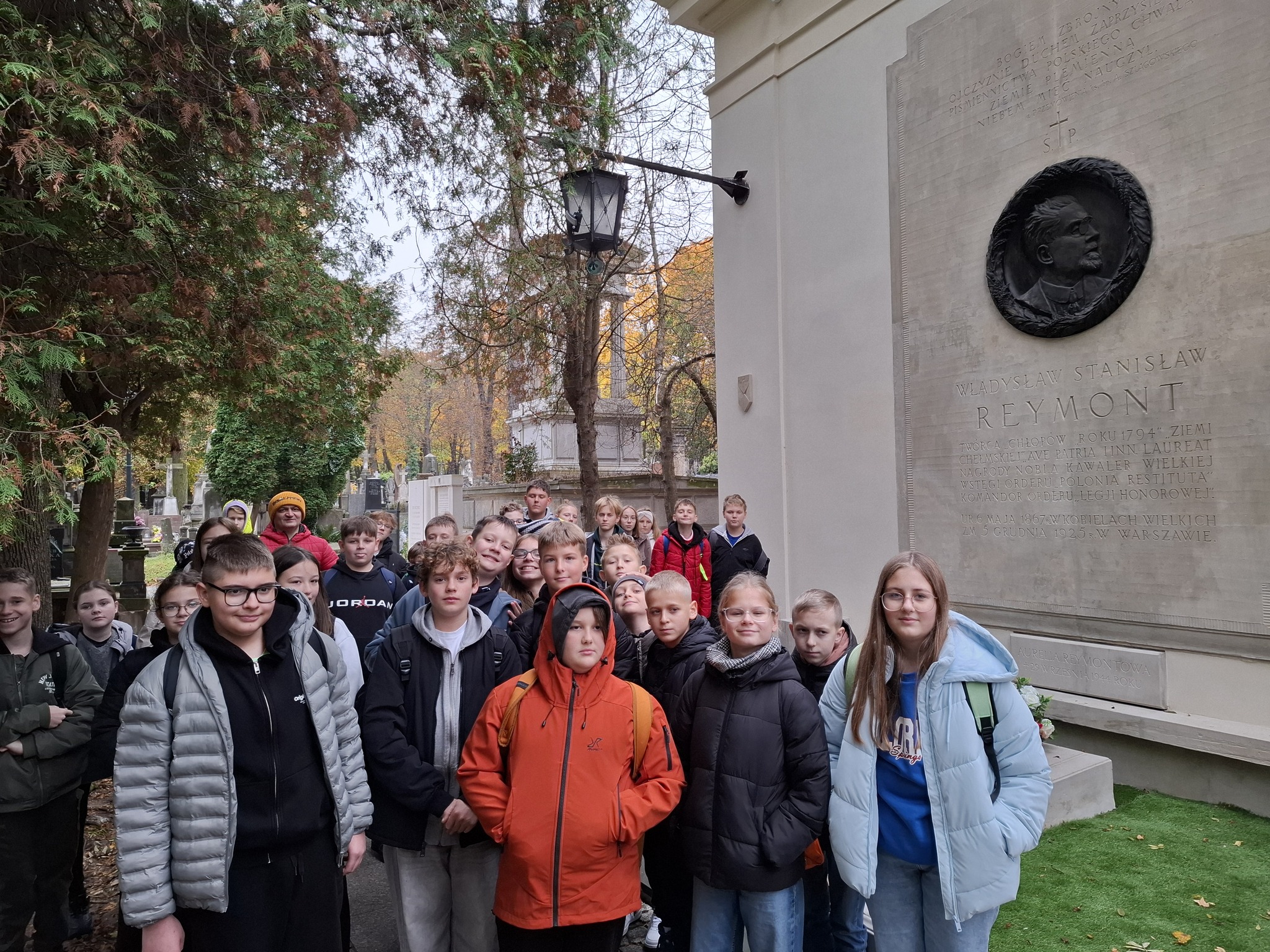 Uczniowie klas piątych, szóstych i siódmych 16 października mieli okazję zwiedzić stolicę Polski. Pierwszym punktem wycieczki były Powązki. Wśród niespotykanych nagrobków Pani Przewodnik w bardzo ciekawy sposób opowiadała o niektórych z nich. Ale najważniejszym dla naszej społeczności szkolnej było oddanie hołdu patronowi naszej szkoły i odwiedzeniu grobu Władysława Stanisława Reymonta. Uczniowie zapalili znicze w hołdzie dla patrona.