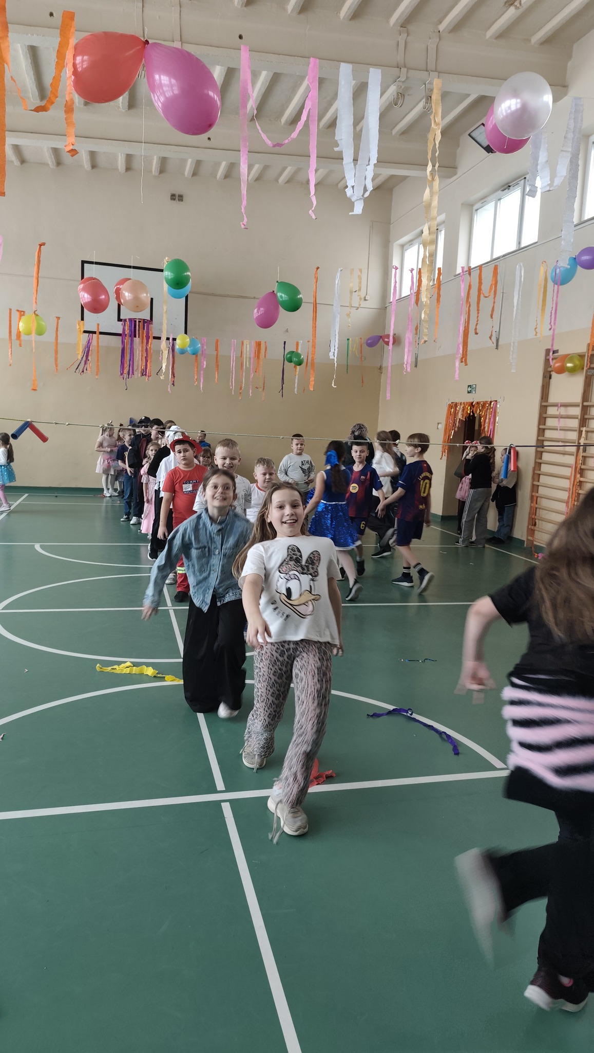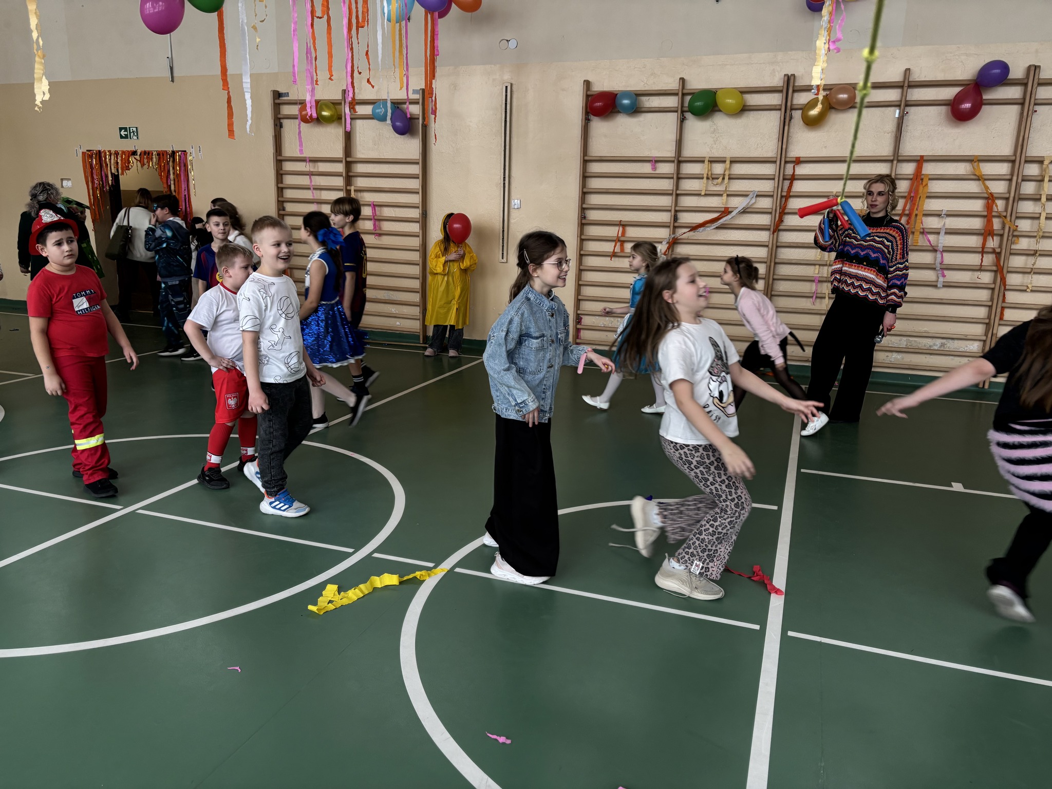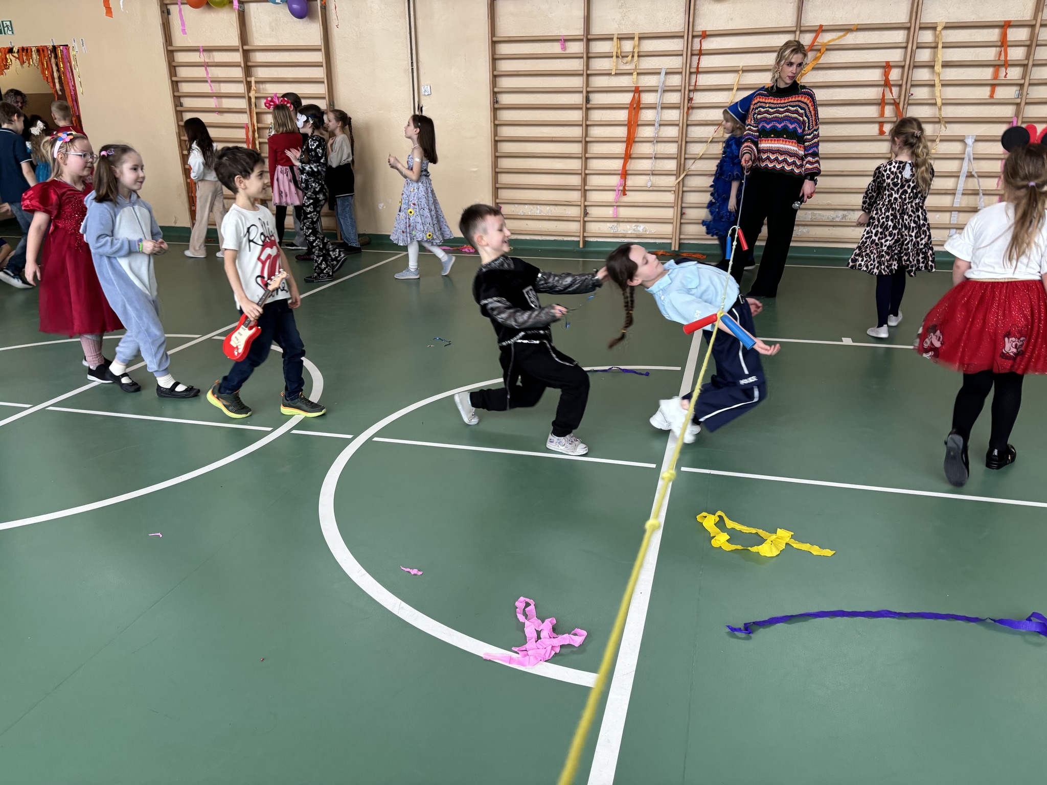 Samorząd Uczniowski zorganizował wspaniałą zabawę karnawałową dla najmłodszych uczniów naszej szkoły. Nasi wychowankowie bawili się przy muzyce z repertuaru dziecięcego, a radości i uśmiechów nie było końca. W programie nie zabrakło atrakcji – nauczyciele poprowadzili liczne zabawy, takie jak: tradycyjny pociąg, zabawa z miotłą i liną, „krasnoludek”, a także pełne śmiechu zawijanie na czas uczennic klas starszych w mumię. Ogromne emocje wzbudził również konkurs taneczny w parach, który wymagał sporej gibkości i koncentracji.