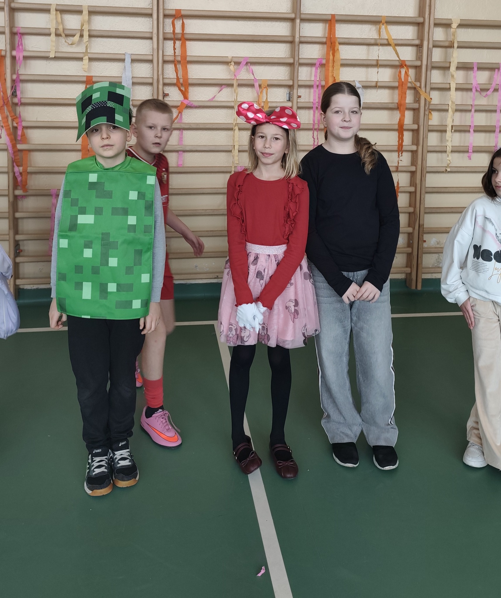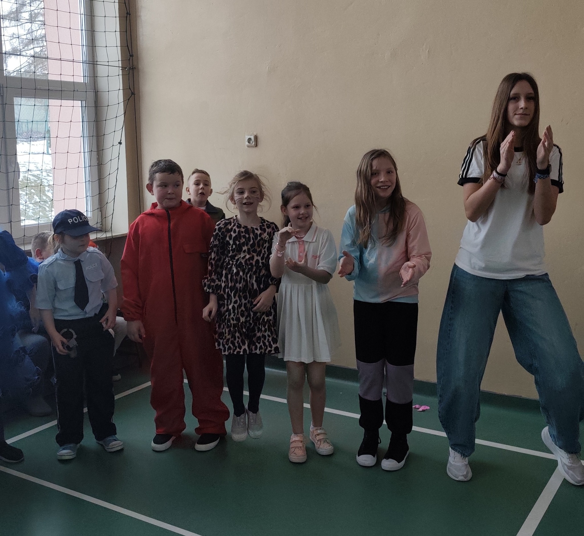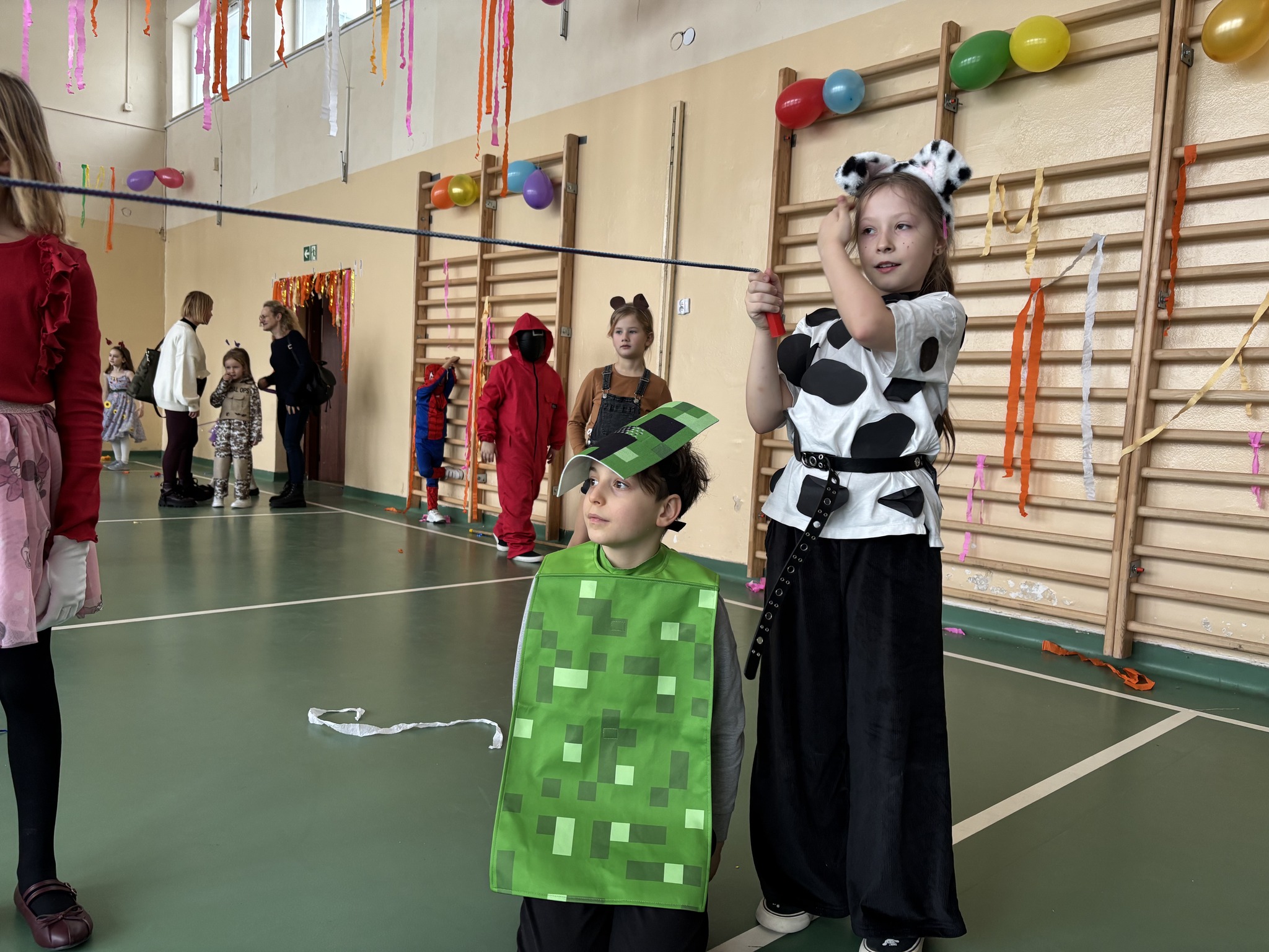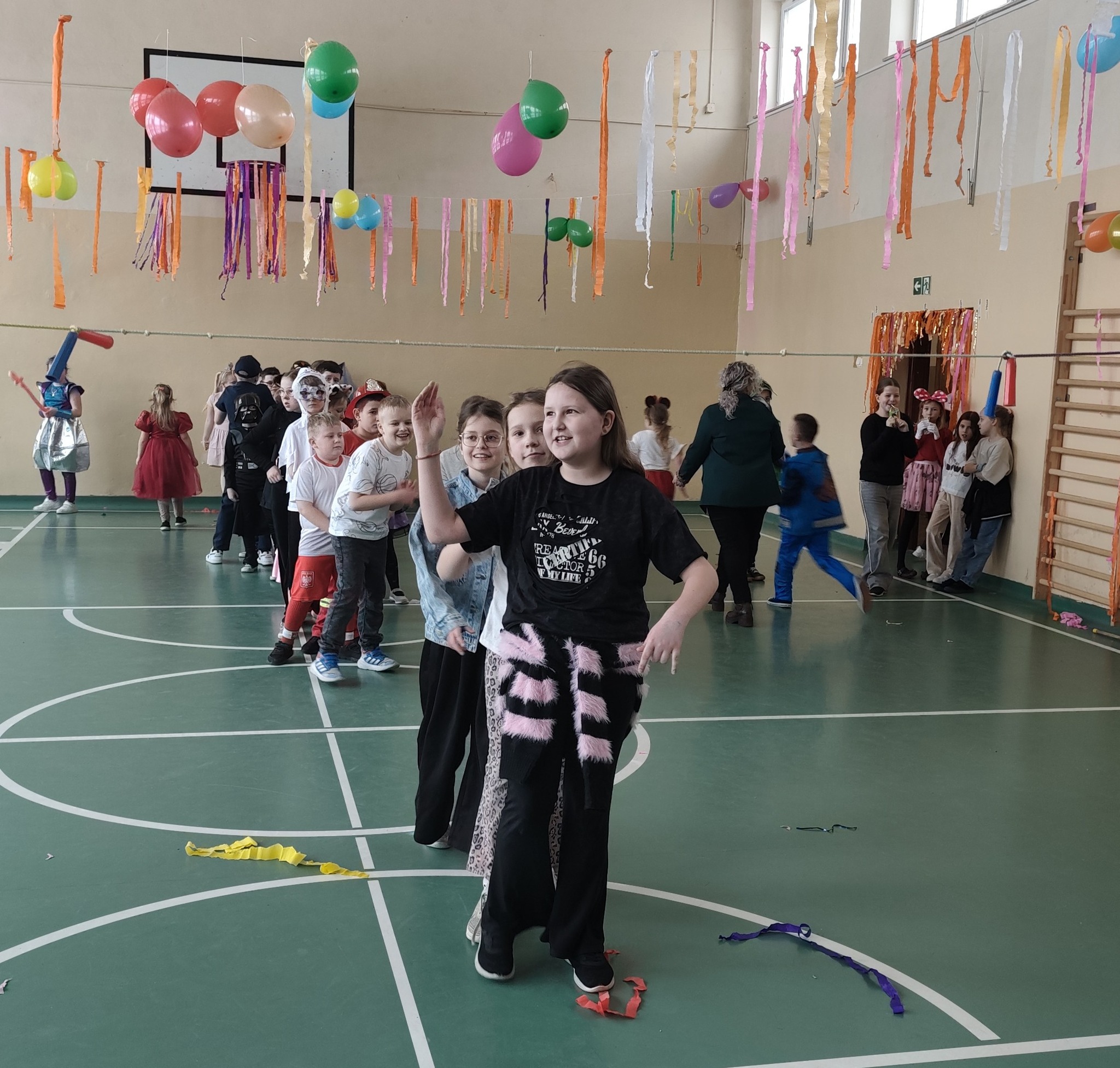 Samorząd Uczniowski zorganizował wspaniałą zabawę karnawałową dla najmłodszych uczniów naszej szkoły. Nasi wychowankowie bawili się przy muzyce z repertuaru dziecięcego, a radości i uśmiechów nie było końca. W programie nie zabrakło atrakcji – nauczyciele poprowadzili liczne zabawy, takie jak: tradycyjny pociąg, zabawa z miotłą i liną, „krasnoludek”, a także pełne śmiechu zawijanie na czas uczennic klas starszych w mumię. Ogromne emocje wzbudził również konkurs taneczny w parach, który wymagał sporej gibkości i koncentracji.
